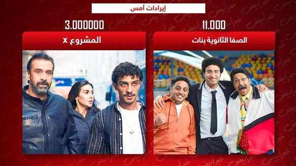 إيرادات الأمس .. المشروع x يتصدر بـ 3 ملايين والصفا الثانوية يكتفي بـ 11 ألف