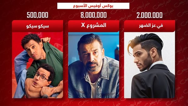 ينافس عدد من الأفلام على صدارة ترتيب بوكس أوفيس الأسبوع، ومنها فيلم المشروع X بطولة كريم عبدالعزيز الذي تصدر قائمة إيرادات شباك التذاكر الأسبوع الماضي، حيث جمع 8 مليون جنيه في أسبوعه السادس بالسينمات.