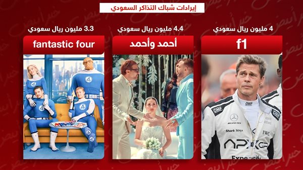 وحقق أحمد وأحمد 4.4 مليون ريال سعودى، بعدما باع 81 ألف تذكرة، وجاء في المركز الثاني f1 بـ 4 ملايين ريال، بينما حقق fantastic4 إيرادات بلغت 3.3 مليون ريال.