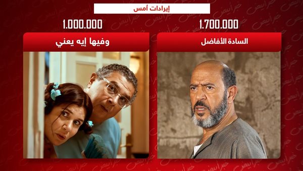 إيرادات الأمس.. السادة الأفاضل يتصدر بمليون و700 ألف وفيها إيه يعني يلاحقه بمليون جنيه