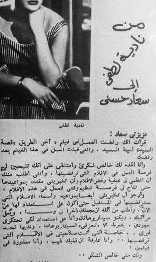 وجاءت الرسالة كما يلي : من نادية لطفي إلى سعاد حسني .. عزيزتى سعاد .. قرأت أنك رفضت العمل فى فيلم آخر الطريق، قصة السيدة أمينة السعيد، وأننى قبلت العمل في هذا الفيلم بعد رفضك .. وأنا أقدم لك خالص شكرى وامتنانى، على أن تتحين لى فرصة العمل في الأفلام التى ترفضينها، وأنني أطلب منك أن تنظمي لى عملية رفض الأفلام وأن تخبريني مقدما بمواعيدها، حتى تتاح لي فرصة تنظيم وقتي للعمل في هذه الأفلام.